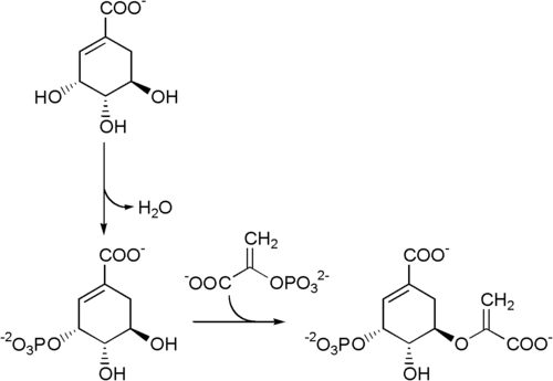 Shikimate → shikimate-3-phosphate → 5-enolpyruvylshikimate-3-phosphate (5-O-(1-carboxyvinyl)-3-phosphoshikimate)