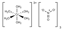 Chromium(III) nitrate describes several inorganic compounds consisting of chromium, nitrate and varying amounts of water. Most common is the dark violet hygroscopic solid. An anhydrous green form is also known. Chromium(III) nitrate compounds are of a limited commercial importance, finding some applications in the dyeing industry.[3] It is common in academic laboratories for the synthesis of chromium coordination complexes.