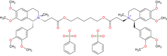 Cisatracurium besilate (INN; cisatracurium besylate (USAN); formerly recognized as 51W89;[1] trade name Nimbex) is a bisbenzyltetrahydroisoquinolinium that has effect as a non-depolarizing neuromuscular-blocking drug, used adjunctively in anesthesia to facilitate endotracheal intubation and to provide skeletal muscle relaxation during surgery or mechanical ventilation. It shows intermediate duration of action. Cisatracurium is one of the ten isomers of the parent molecule, atracurium.[2] Moreover, cisatracurium represents approximately 15% of the atracurium mixture.[3]