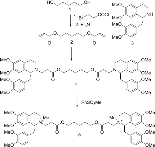 Treatment of 1,5-Pentanediol with 3-bromopropionyl chloride gives the corresponding ester; dehydrohalogenation of the ester with triethylamine then gives the bis-acrylate (2). Reaction of that unsaturated ester with tetrahydropapaverine[13][14] (3) leads to conjugate addition of the secondary amine and formation of the intermediate (4). Alkylation with methyl benzenesulfonate forms the bis-quaternary salt, affording cisatracuronium (5).