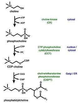 25. ^ Fernández-Murray JP, McMaster CR (Nov 2005). "Glycerophosphocholine catabolism as a new route for choline formation for phosphatidylcholine synthesis by the Kennedy pathway". The Journal of Biological Chemistry. 280 (46): 38290–6. doi:10.1074/jbc.M507700200. PMID 16172116.