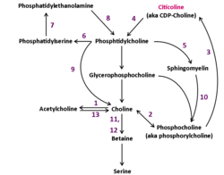 Citicoline is available as a supplement in over 70 countries under a variety of brand names: CereBleu, Cebroton, Ceraxon, Cidilin, Citifar, Cognizin, Difosfocin, Hipercol, NeurAxon, Nicholin, Sinkron, Somazina, Synapsine, Startonyl, Trausan, Xerenoos, etc.[1] When taken as a supplement, citicoline is hydrolyzed into choline and cytidine in the intestine.[2] Once these cross the blood–brain barrier, they are reformed into citicoline by the rate-limiting enzyme in phosphatidylcholine synthesis, CTP-phosphocholine cytidylyltransferase.[3][4]
