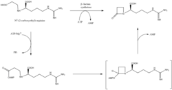 - ^ Bachmann BO, Townsend CA (September 2000). "Kinetic mechanism of the beta-lactam synthetase of Streptomyces clavuligerus". Biochemistry. 39 (37): 11187–11193. doi:10.1021/bi000709i. PMID 10985764.