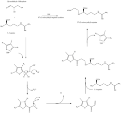 CEA synthase is a 60.9 kDA protein and is the first gene found in the clavulanic acid biosynthesis gene cluster, encoded by orf2 of the clavulanic acid gene cluster. The specific mechanism of how this enzyme works is still under investigation; however, it is known that this enzyme has the ability to couple together glyceraldehyde-3-phosphate with L-arginine in the presence of thiamine diphosphate (TDP or thiamine pyrophosphate), which is the first step of the clavulanic acid biosynthesis.[14]