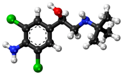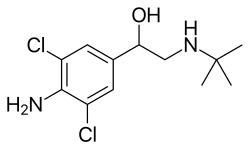 Clenbuterol is a sympathomimetic amine used by sufferers of breathing disorders as a decongestant and bronchodilator. People with chronic breathing disorders such as asthma use this as a bronchodilator to make breathing easier. It is most commonly available as the hydrochloride salt, clenbuterol hydrochloride.[2]