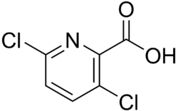 Clopyralid (3,6-dichloro-2-pyridinecarboxylic acid) is a selective herbicide used for control of broadleaf weeds, especially thistles and clovers. Clopyralid is in the picolinic acid family of herbicides, which also includes aminopyralid, picloram, triclopyr, and several less common herbicides.[2][3] For control of creeping thistle, Cirsium arvense, a noxious, perennial weed, clopyralid is one of the few effective herbicides available. It is particularly damaging to peas, tomatoes, and sunflowers, and can render potatoes, lettuce, and spinach inedible.[4] It does not affect grasses (family Poaceae).