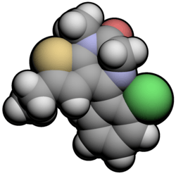 Clotiazepam[3] (marketed under brand name Clozan, Distensan, Trecalmo, Rize, Rizen and Veratran) is a thienodiazepine drug which is a benzodiazepine analog. The clotiazepam molecule differs from benzodiazepines in that the benzene ring has been replaced by a thiophene ring.[4] It possesses anxiolytic,[5] skeletal muscle relaxant,[6] anticonvulsant, sedative properties.[7] Stage 2 NREM sleep is significantly increased by clotiazepam.[8]