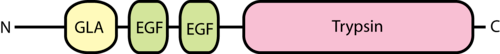 Factors VII, IX, and X all play key roles in blood coagulation and also share a common domain architecture.[10] The factor IX protein is composed of four protein domains: the Gla domain, two tandem copies of the EGF domain and a C-terminal trypsin-like peptidase domain which carries out the catalytic cleavage.