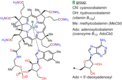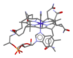Vitamin B12 is a coordination complex of cobalt, which occupies the center of a corrin ligand and is further bound to a benzimidazole ligand and adenosyl group.[15] Several related species behave similarly to function as vitamins. This collection of compounds is sometimes referred to as "cobalamins". These chemical compounds have a similar molecular structure, each of which shows vitamin activity in a vitamin-deficient biological system. They are referred to as vitamers having vitamin activity as a coenzyme, meaning that its presence is required for some enzyme-catalyzed reactions.[16][17]