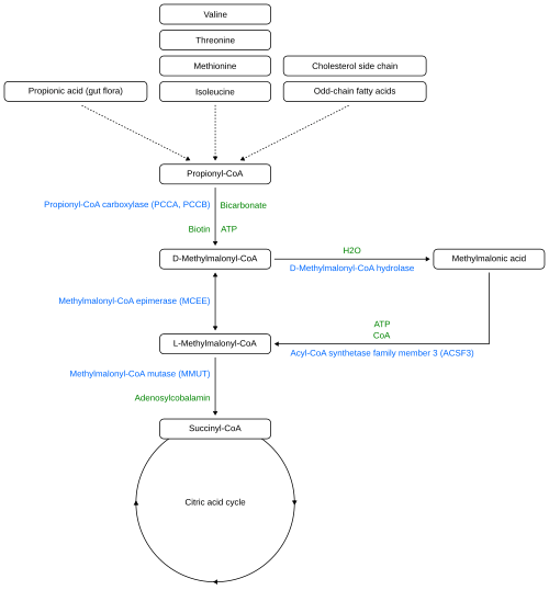 119. ^ Ballhausen D, Mittaz L, Boulat O, Bonafé L, Braissant O (December 2009). "Evidence for catabolic pathway of propionate metabolism in CNS: expression pattern of methylmalonyl-CoA mutase and propionyl-CoA carboxylase alpha-subunit in developing and adult rat brain". Neuroscience. 164 (2): 578–587. doi:10.1016/j.neuroscience.2009.08.028. PMID 19699272. S2CID 34612963.