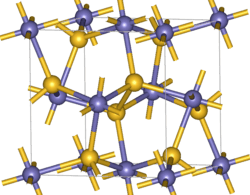 Cobalt sulfides occur widely as minerals, comprising major sources of all cobalt compounds. Binary cobalt sulfide minerals include the cattierite (CoS2) and linnaeite (Co3S4). CoS2 (see image in table) is isostructural with iron pyrite, featuring disulfide groups, i.e. Co2+S22−. Linnaeite, also rare, adopts the spinel motif.[3] The Co9S8 compound is known as a very rare cobaltpentlandite (the Co analogue of pentlandite).[4] Mixed metal sulfide minerals include carrollite (CuCo2S4) and siegenite (Co3−xNixS4).