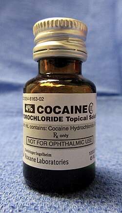 Cocaine is sometimes used in otorhinolaryngology as a topical anesthetic and vasoconstrictor to help control pain and bleeding during surgery of the nose, mouth, throat, or lacrimal duct. It is also used for topical airway anaesthesia for procedures such as awake fibreoptic bronchoscopy or intubation. Although some absorption and systemic effects may occur, the use of cocaine as a topical anesthetic and vasoconstrictor is generally safe, rarely causing cardiovascular toxicity, glaucoma, and pupil dilation.[72][23] Occasionally, cocaine is mixed with adrenaline and sodium bicarbonate and used topically for surgery, a formulation called Moffett's solution.[73] It is occasionally used in surgeries involving the pharynx or nasopharynx to reduce pain, bleeding, and vocal cord spasm.[74]