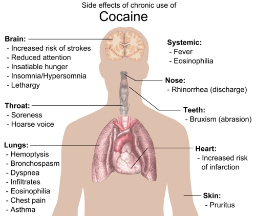 Cocaine has numerous adverse effects. Acute use can cause vasoconstriction, tachycardia, hypertension, hyperthermia, or seizures, while overdose may lead to stroke, heart attack, or sudden cardiac death.[20][15][29] It also produces a spectrum of psychiatric symptoms, including agitation, paranoia, anxiety, irritability, psychosis, hallucinations, delusions, violence, and suicidal or homicidal thinking.[30][20] Prenatal exposure poses risks to fetal development.[31][32][33][34] Chronic use may result in cocaine dependence, withdrawal symptoms, neurotoxicity, and nasal damage, including cocaine-induced midline destructive lesions.[35][36][37][38][39][40]