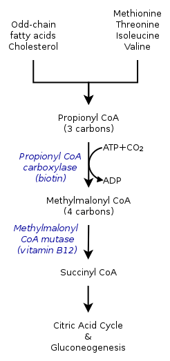 12 (as adenosylcobalamin) to make succinyl-CoA. When the conversion of propionyl-CoA to succinyl-CoA in the mitochondria fails due to Vitamin B