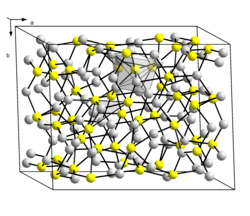 Two forms (a dimorphism) of Cu2S are known. The so-called low temperature monoclinic form ("low-chalcocite") has a complex structure with 96 copper atoms in the unit cell.[7] The hexagonal form, stable above 104 °C (219 °F),[8] has 24 crystallographically distinct Cu atoms. Its structure has been described as approximating to a hexagonal close packed array of sulfur atoms with Cu atoms in planar 3 coordination. This structure was initially assigned an orthorhombic cell due to the twinning of the sample crystal.