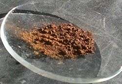 Copper(II) chloride occurs naturally as the very rare anhydrous mineral tolbachite and the dihydrate eriochalcite.[29] Both are found near fumaroles and in some copper mines.[30][31][32] Mixed oxyhydroxide-chlorides like atacamite (Cu2(OH)3Cl) are more common, arising among Cu ore beds oxidation zones in arid climates.[33]
