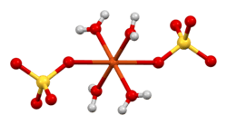 Copper(II) sulfate is an inorganic compound with the chemical formula CuSO4. It forms hydrates CuSO4·nH2O, where n can range from 1 to 7. The pentahydrate (n = 5), a bright blue crystal, is the most commonly encountered hydrate of copper(II) sulfate,[10] while its anhydrous form is white.[11] Older names for the pentahydrate include blue vitriol, bluestone,[12] vitriol of copper,[13] and Roman vitriol.[14] It exothermically dissolves in water to give the aquo complex [Cu(H2O)6]2+, which has octahedral molecular geometry. The structure of the solid pentahydrate reveals a polymeric structure wherein copper is again octahedral but bound to four water ligands. The Cu(II)(H2O)4 centers are interconnected by sulfate anions to form chains.[15]