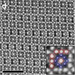 ![]() TEM image of CuTe viewed along the a axis. Red and blue circles mark Te and Cu.