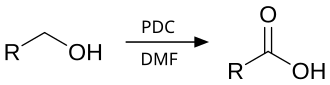 The Cornforth reagent is a strong oxidizing agent which can convert primary alcohols to aldehydes and secondary alcohols to ketones, both as a solution or suspension. This application was first mentioned in 1969, but fully developed only in 1979 by E. J. Corey and G. Schmidt. They mentioned that reaction of saturated primary alcohols with PDC, using dimethylformamide as solvent, results in oxidation to carboxylic acids rather than aldehydes. However, no oxidation to carboxylic acids occurs on allylic and benzylic primary alcohols.[6]