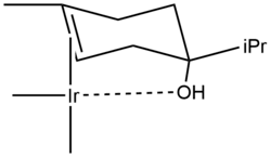 The hydrogenation of a terpen-4-ol demonstrates the ability of compounds with directing groups (the –OH group) to undergo diastereoselective hydrogenation. With palladium on carbon in ethanol the product distribution is 20:80 favoring the cis isomer (2B in Scheme 1). The spatial arrangement of the cyclohexene ring creates a polar face and a non-polar face. During the reaction, one face must orient toward the surface of the catalyst while the other faces the solvent. In ethanol, the polar face preferentially interacts with the solvent via hydrogen bonding, resulting in selective hydrogenation from the non-polar face. In cyclohexane, this effect is removed; however, a slight preference for hydrogenation from the polar face due to the haptophilicty of the hydroxyl group results in a ratio 53:47 favoring the trans isomer. Haptophilicity is a property which promotes a functional group to donate electron density to the metal center of catalyst, directing the reaction.[11][12] The distribution changes completely in favor of the trans isomer 2A when Crabtree's catalyst is used in dichloromethane as haptophilic effects dominate. This selectivity is both predictable and practically useful.[13] Carbonyl groups (and other Lewis-basic groups) are also known to direct the hydrogenation by the Crabtree catalyst to be highly regioselective.[14][15][16]
