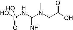 Creatine (/ˈkriːətiːn/ or /ˈkriːətɪn/)[1] is an organic compound that, in vertebrates, facilitates recycling of adenosine triphosphate (ATP), primarily in muscle and brain tissue. Its phosphorylated form, phosphocreatine, donates phosphate groups to adenosine diphosphate (ADP), turning it back into ATP. Creatine also acts as a buffer.[2] It has the nominal formula (H2N)(HN)CN(CH3)CH2CO2H and in solutions, exists in various tautomers, including a neutral form and zwitterionic forms.