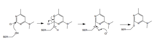 The serine residue, which is part of the acetylcholinesterase, acts a nucleophile and eventually replaces the C-Cl bond that is present in crimidine. Unlike with acetylcholine, the resulting serine-crimidine bond does not hydrolyze, permanently deactivating the enzyme