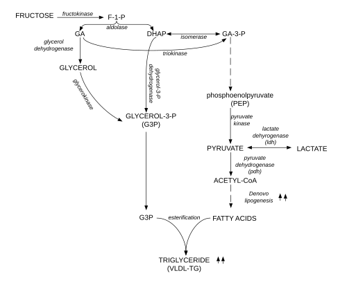 Carbons from dietary fructose are found in both the free fatty acid and glycerol moieties of plasma triglycerides. High fructose consumption can lead to excess pyruvate production, causing a buildup of Krebs cycle intermediates.[56] Accumulated citrate can be transported from the mitochondria into the cytosol of hepatocytes, converted to acetyl CoA by citrate lyase and directed toward fatty acid synthesis.[56][57] In addition, DHAP can be converted to glycerol 3-phosphate, providing the glycerol backbone for the triglyceride molecule.[57] Triglycerides are incorporated into very-low-density lipoproteins (VLDL), which are released from the liver destined toward peripheral tissues for storage in both fat and muscle cells.