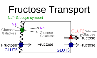 The mechanism of fructose absorption in the small intestine is not completely understood. Some evidence suggests active transport, because fructose uptake has been shown to occur against a concentration gradient.[39] However, the majority of research supports the claim that fructose absorption occurs on the mucosal membrane via facilitated transport involving GLUT5 transport proteins.[40] Since the concentration of fructose is higher in the lumen, fructose is able to flow down a concentration gradient into the enterocytes, assisted by transport proteins. Fructose may be transported out of the enterocyte across the basolateral membrane by either GLUT2 or GLUT5, although the GLUT2 transporter has a greater capacity for transporting fructose, and, therefore, the majority of fructose is transported out of the enterocyte through GLUT2.[40]