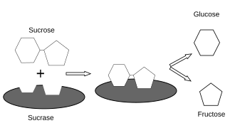 Fructose exists in foods either as a monosaccharide (free fructose) or as a unit of a disaccharide (sucrose). Free fructose is a ketonic simple sugar and one of the three dietary monosaccharides absorbed directly by the intestine. When fructose is consumed in the form of sucrose, it is digested (broken down) and then absorbed as free fructose. As sucrose comes into contact with the membrane of the small intestine, the enzyme sucrase catalyzes the cleavage of sucrose to yield one glucose unit and one fructose unit, which are then each absorbed. After absorption, it enters the hepatic portal vein and is directed toward the liver.