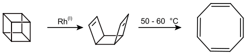 With a rhodium catalyst, cubane first forms syn-tricyclooctadiene, which can thermally decompose to cyclooctatetraene at 50–60 °C.[14]