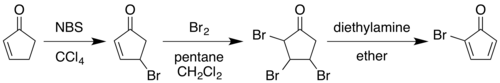 Allylic bromination with N-bromosuccinimide in carbon tetrachloride followed by addition of molecular bromine to the alkene gives a 2,3,4-tribromocyclopentanone. Treating this compound with diethylamine in diethyl ether causes elimination of two equivalents of hydrogen bromide to give the diene product.