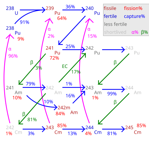 Further neutron capture followed by β−-decay gives americium (241Am) which further becomes 242Cm: