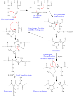 - ^ a b c Kaiser, R.; Metzka, L. (1999). "Enhancement of Cyanogen Bromide Cleavage Yields for Methionyl-Serine and Methionyl-Threonine Peptide Bonds". Analytical Biochemistry. 266 (1): 1–8. doi:10.1006/abio.1998.2945. PMID 9887207.