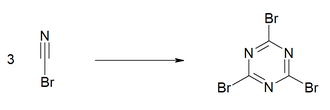 When refrigerated the material has an extended shelflife. Like some other cyanogen compounds, cyanogen bromide undergoes an exothermic trimerisation to cyanuric bromide ((BrCN)3). This reaction is catalyzed by traces of bromine, metal salts, acids and bases. For this reason, experimentalists avoid brownish samples.[4]