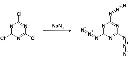 Cyanuric triazide can be synthesized via the nucleophilic aromatic substitution of cyanuric trichloride with an excess of sodium azide in heated acetone. The white crystals can then be purified via recrystallization from −20 °C toluene.[6]
