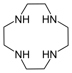 Cyclen (1,4,7,10-tetraazacyclododecane) is an aza-crown ether with the formula (CH2CH2NH)4. It is a white solid. It forms coordination complexes with metal cations and is used to synthesize the chelating agent DOTA which has several medical applications. Being structurally simple, symmetrical, and polyfunctional, cyclen has been widely investigated.[2]