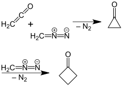 A newer, more efficient preparation of cyclobutanone was found by P. Lipp and R. Köster in which a solution of diazomethane in diethyl ether is reacted with ketene.[5] This reaction is based on a ring expansion of the cyclopropanone intermediate initially formed, wherein molecular nitrogen is split off: