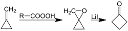 Another synthesis of cyclobutanone involves lithium iodide catalyzed rearrangement of oxaspiropentane, which is formed by epoxidation of the easily accessible methylenecyclopropane:[7][8]