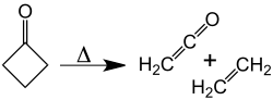 At about 350 °C, cyclobutanone decomposes into ethylene and ketene.[10] The activation energy for this [2+2] cycloelimination is 52 kcal/mol. The reverse reaction, the [2+2] cycloaddition of ketene and ethylene, has never been observed.
