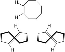 Cyclooctene is notable because it is the smallest cycloalkene that can exist stably as either the cis or trans stereoisomer, with cis-cyclooctene being the most common. Theoretical analysis implies a total of 16 conformational and configurational isomers, all chiral, forming 8 enantiomeric pairs.[1] The cis isomer can adopt various conformations, the most stable one being shaped like a ribbon.[1] The most stable conformation of trans-cyclooctene is shaped like the 8-carbon equivalent of the chair conformation of cyclohexane.