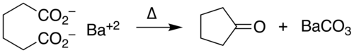 Ketonic decarboxylation of adipic acid gives cyclopentanone. The reaction is conducted at elevated temperatures in the presence of barium hydroxide.[3]