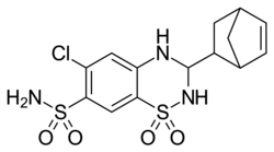 Cyclothiazide (Anhydron, Acquirel, Doburil, Fluidil, Renazide, Tensodiural, Valmiran), sometimes abbreviated CTZ, is a benzothiadiazide (thiazide) diuretic and antihypertensive that was originally introduced in the United States in 1963 by Eli Lilly and was subsequently also marketed in Europe and Japan.[1][2] Related drugs include diazoxide, hydrochlorothiazide, and chlorothiazide.[3]