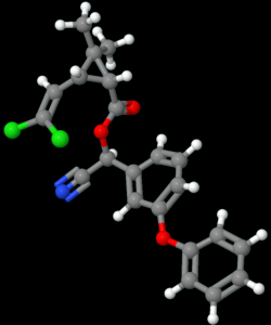 Cypermethrin (CP) is a synthetic pyrethroid used as an insecticide in large-scale commercial agricultural applications as well as in consumer products for domestic purposes. It behaves as a fast-acting neurotoxin in insects. It is easily degraded on soil and plants but can be effective for weeks when applied to indoor inert surfaces. It is a non-systemic and non-volatile insecticide that acts by contact and ingestion, used in agriculture and in pest control products. Exposure to sunlight, water and oxygen will accelerate its decomposition. Cypermethrin is highly toxic to fish, bees and aquatic insects, according to the National Pesticide Information Center (NPIC) (previously National Pesticides Telecommunication Network) in the USA.[1] It is found in many household ant and cockroach killers, including Raid, Ortho, Combat, ant chalk, and some variants of Baygon in Southeast Asia.