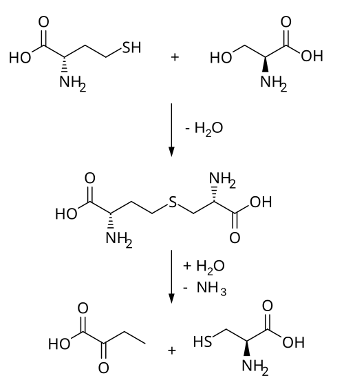 Biosynthetically, cystathionine is generated from homocysteine and serine by cystathionine beta synthase (upper reaction in the diagram below). It is then cleaved into cysteine and α-ketobutyrate by cystathionine gamma-lyase (lower reaction).