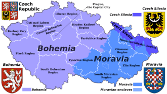 The country has been traditionally divided into three lands, namely Bohemia (Čechy) in the west, Moravia (Morava) in the east, and Czech Silesia (Slezsko; the smaller, south-eastern part of historical Silesia, most of which is located within modern Poland) in the northeast.[30] Known as the lands of the Bohemian Crown since the 14th century, a number of other names for the country have been used, including Czech/Bohemian lands, Bohemian Crown, Czechia,[31] and the lands of the Crown of Saint Wenceslaus. When the country regained its independence after the dissolution of the Austro-Hungarian empire in 1918, the new name of Czechoslovakia was coined to reflect the union of the Czech and Slovak nations within one country.[32]