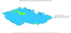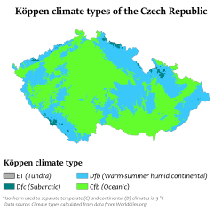 The Czech Republic has a temperate climate, situated in the transition zone between the oceanic and continental climate types, with warm summers and cold, cloudy and snowy winters. The temperature difference between summer and winter is due to the landlocked geographical position.[94]