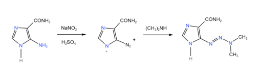 Nitrous acid is added to 5-aminoimidazol-4-carboxamide to make 5-diazoimidazol-4-carboxamide. It reacts with dimethylamine to give dacarbazine.[15]