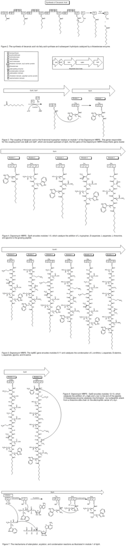 The NRPS responsible for the synthesis of daptomycin is encoded by three overlapping genes, dptA, dptBC and dptD. The dptE and dptF genes, immediately upstream of dptA, are likely to be involved in the initiation of daptomycin biosynthesis by coupling decanoic acid to the N-terminal Trp.[29] These novel genes (dptE, dptF) correspond to products that most likely work in conjunction with a unique condensation domain to acylate the first amino acid (tryptophan). These and other novel genes (dptI, dptJ) are believed to be involved in supplying the nonproteinogenic amino acids L-3-methylglutamic acid and Kyn; they are located next to the NRPS genes.[29]