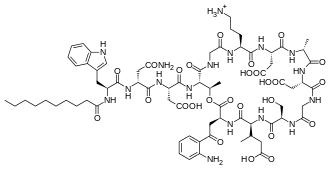 Daptomycin is a cyclic lipopeptide antibiotic produced by Streptomyces filamentosus.[27][28] Daptomycin consists of 13 amino acids, 10 of which are arranged in a cyclic fashion, and three on an exocyclic tail. Two nonproteinogenic amino acids exist in the drug, the unusual amino acid L-kynurenine (Kyn), only known to daptomycin, and L-3-methylglutamic acid (mGlu). The N-terminus of the exocyclic tryptophan residue is coupled to decanoic acid, a medium-chain (C10) fatty acid. Biosynthesis is initiated by the coupling of decanoic acid to the N-terminal tryptophan, followed by the coupling of the remaining amino acids by nonribosomal peptide synthetase (NRPS) mechanisms. Finally, a cyclization event occurs, which is catalyzed by a thioesterase enzyme, and subsequent release of the lipopeptide is granted.