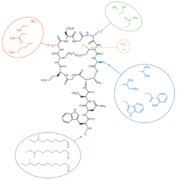 - ^ Nguyen KT, Ritz D, Gu JQ, Alexander D, Chu M, Miao V, et al. (November 2006). "Combinatorial biosynthesis of novel antibiotics related to daptomycin". Proceedings of the National Academy of Sciences of the United States of America. 103 (46): 17462–17467. Bibcode:2006PNAS..10317462N. doi:10.1073/pnas.0608589103. PMC 1859951. PMID 17090667.